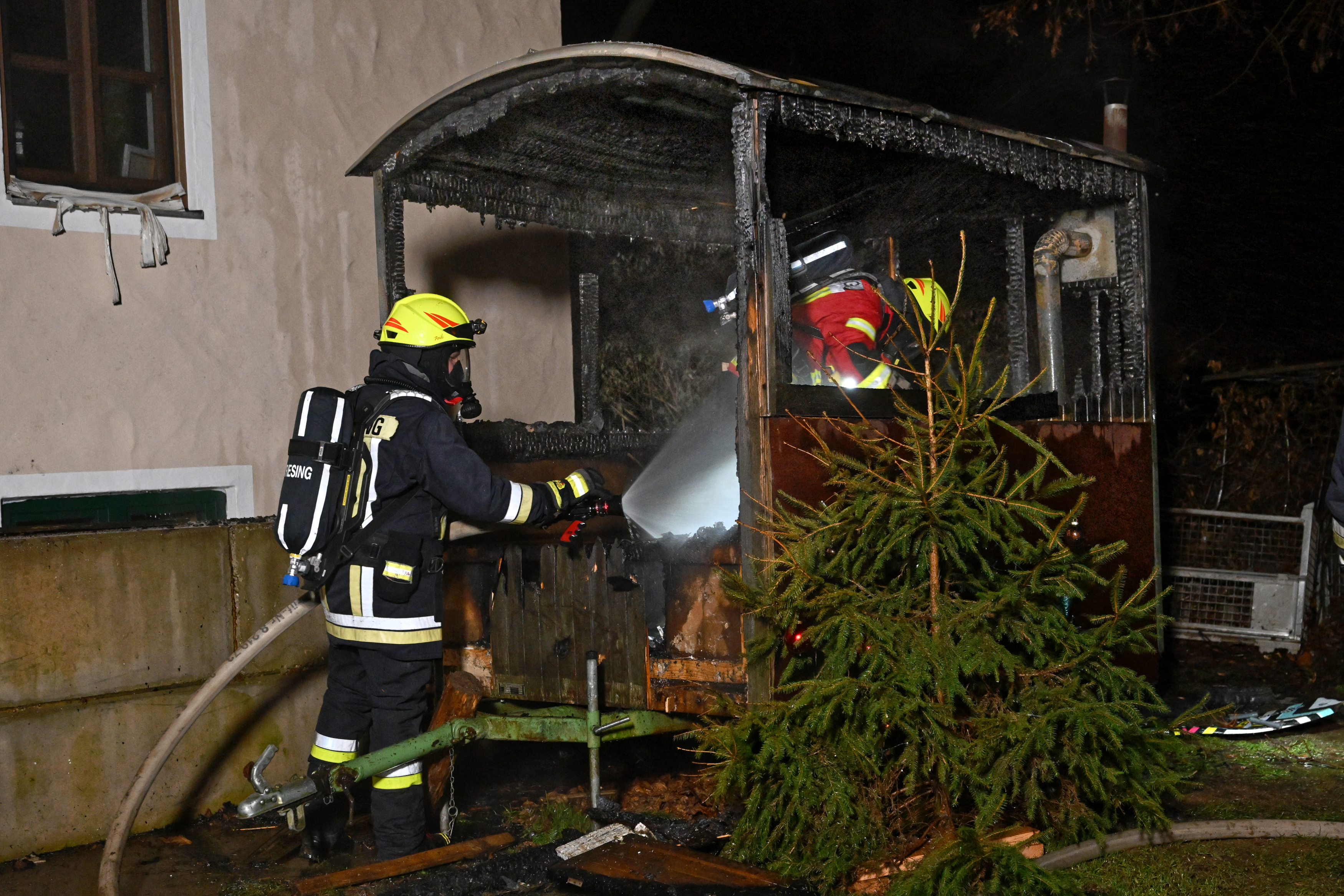 Bauwagen zügig ablöschen. Ein Übergreifen der Flammen auf das